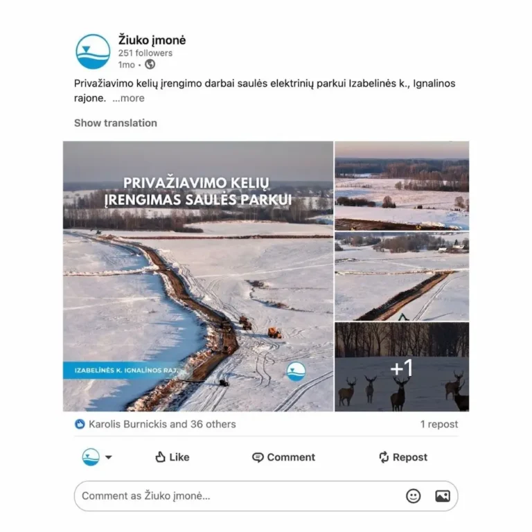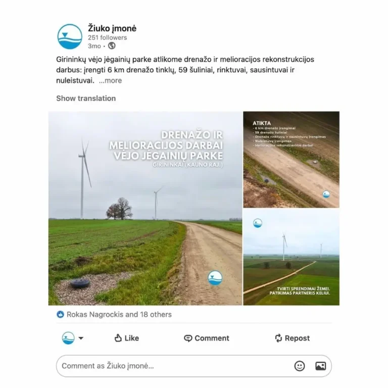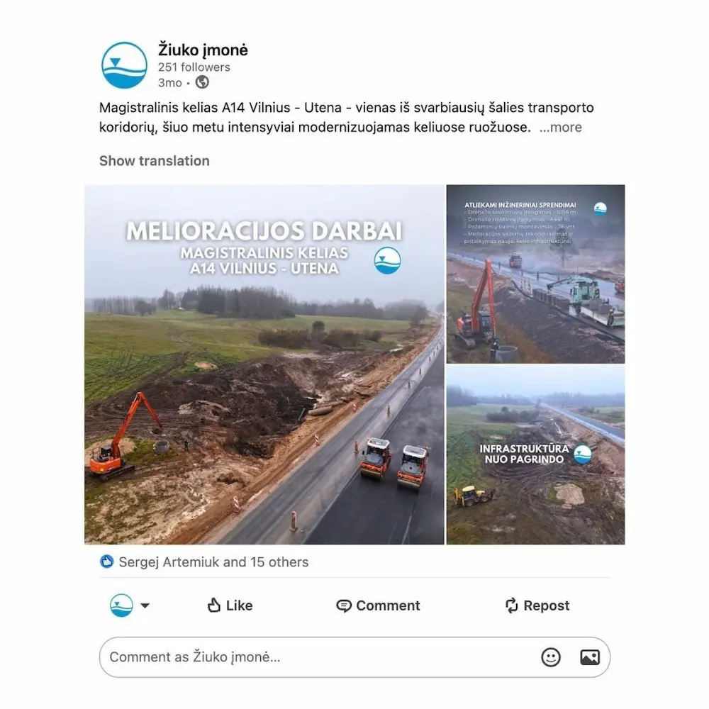 Sukurtas turinys naudojamas LinkedIn komunikacijai: – reguliarūs įrašai – aiškus projektų pristatymas – nuoseklus vizualinis identitetas.